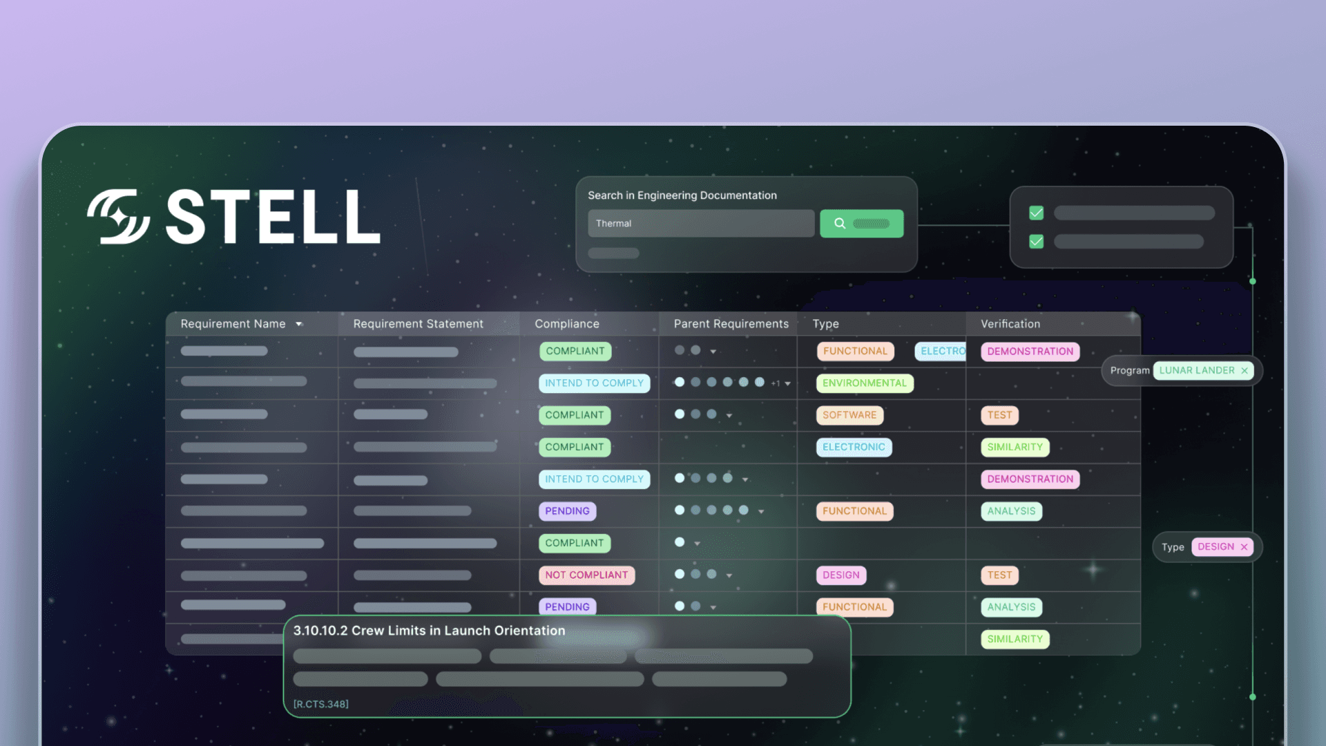 Built by Aerospace industry insiders, Stell empowers engineers with a database of mission and design data, to make their review and compliance workflows lightning fast.